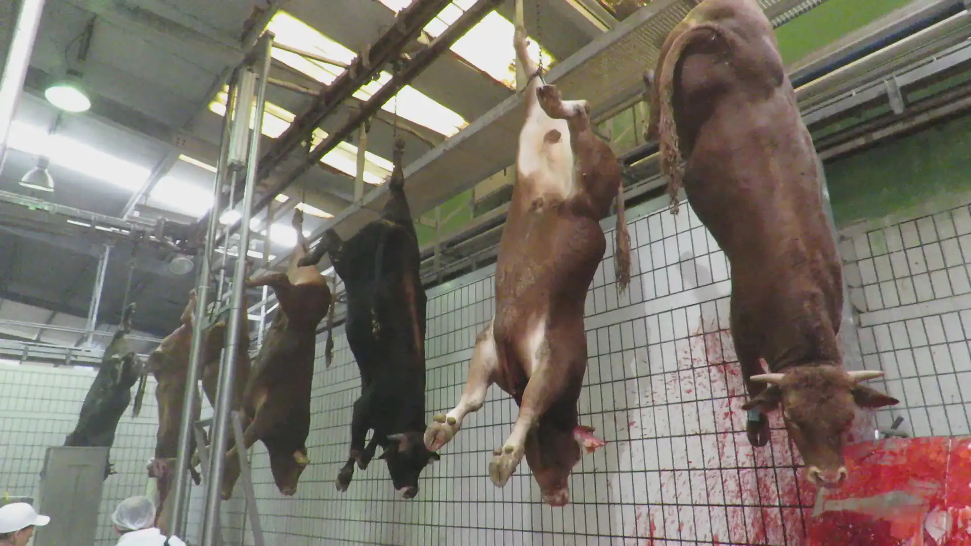During the transfer time in the bleeding conveyor, in addition to the bleeding itself, other operations can be performed on the carcass, such as electrical stimulation, cutting of hands and horns, removing the face of the animal and in some countries the knotting of the esophagus.